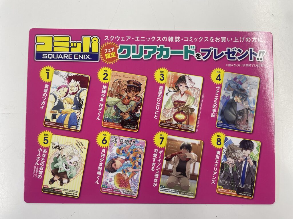 2025年冬 コミッパ開催中 2025年12月5日 最終更新日時 : 2025年12月5日 sakitamabook スクウェアエニックスの雑誌、コミック、ノベルお買い上げの方に特製クリアカードを差し上げています。(全8種、なくなり次第終了)
