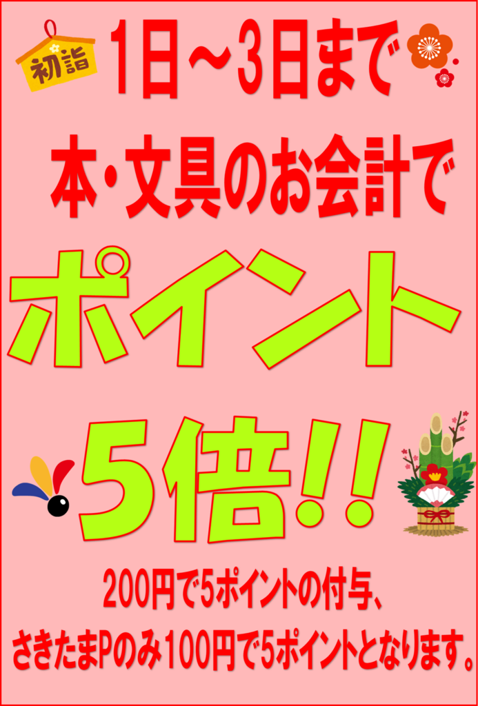 お正月ポイント5倍! 2025年12月28日 最終更新日時 : 2025年12月28日 sakitamabook 1日から3日まで本・文具のお会計で 【ポイント5倍】となります! ぜひ、お正月はさきたま書店へ足をお運びください。